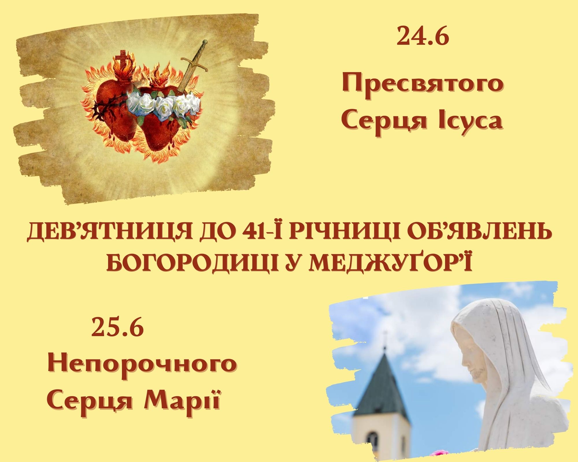 24 червня 2022 року припадає свято Пресвятого Серця Ісуса. Саме цього дня Діва Марія вперше з’явилася в Меджуґор’ї. 25 червня 2022 року, святкуємо річницю об’явлень, – пам’ять Непорочного Серця Марії, день, коли візіонери вперше молилися й розмовляли з Царицею миру.
