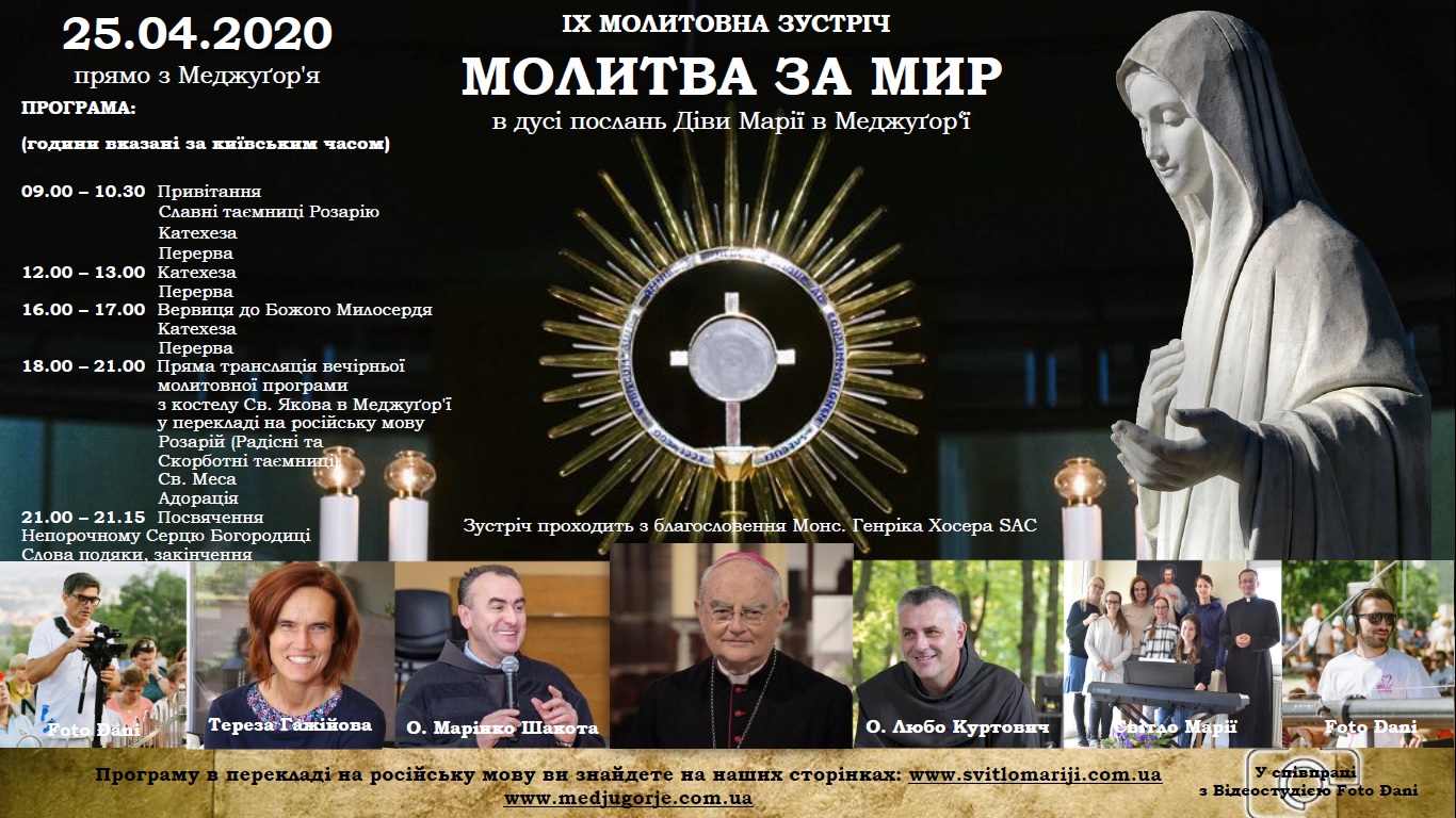 У зв’язку з неможливістю проведення в м. Попрад (Словаччина) Меджуґорської молитовної зустрічі «Молитва за мир», запланованої на 25.04.2020 р., ми вирішили організувати її через Інтернет у співпраці з відеостудією DANI прямо з Меджуґор’я.