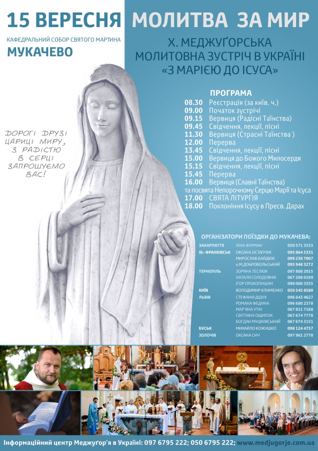 Дорогі друзі, запрошуємо Вас молитися разом із нами. У суботу 15 вересня 2018 року з 9.00 до 19.00 відбудеться Молитовна зустріч в Україні в дусі послань Матері Божої з Меджуґор’я. Тема зустрічі:”Молитва за мир”.