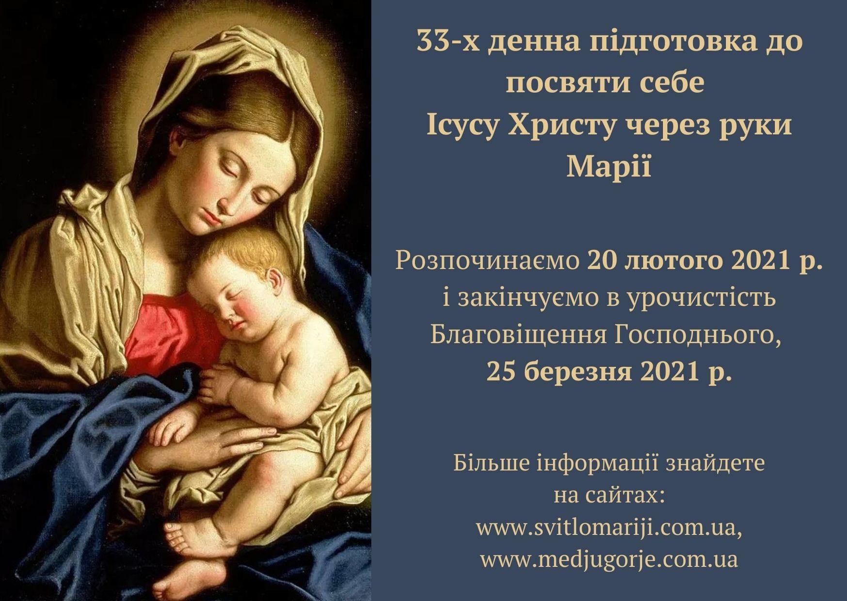 33-х денна підготовка до посвяти розпочнеться 20 лютого, а кульмінацією буде урочисте посвячення себе, наших сімей, а також усього, що нам дороге Ісусу Христу через руки Марії – 25 березня 2021 року в урочистість Благовіщення Господнього.